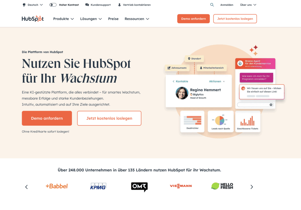 »Nutzen Sie Hubspot für Ihr Wachstum« stellt den Mehrwert für Enduser klar in den Mittelpunkt. Für eine bekannte Marke wie Hubspot ist das super. Allerdings wäre diese Überschrift für weniger bekannte Anbieter nicht empfehlenswert.