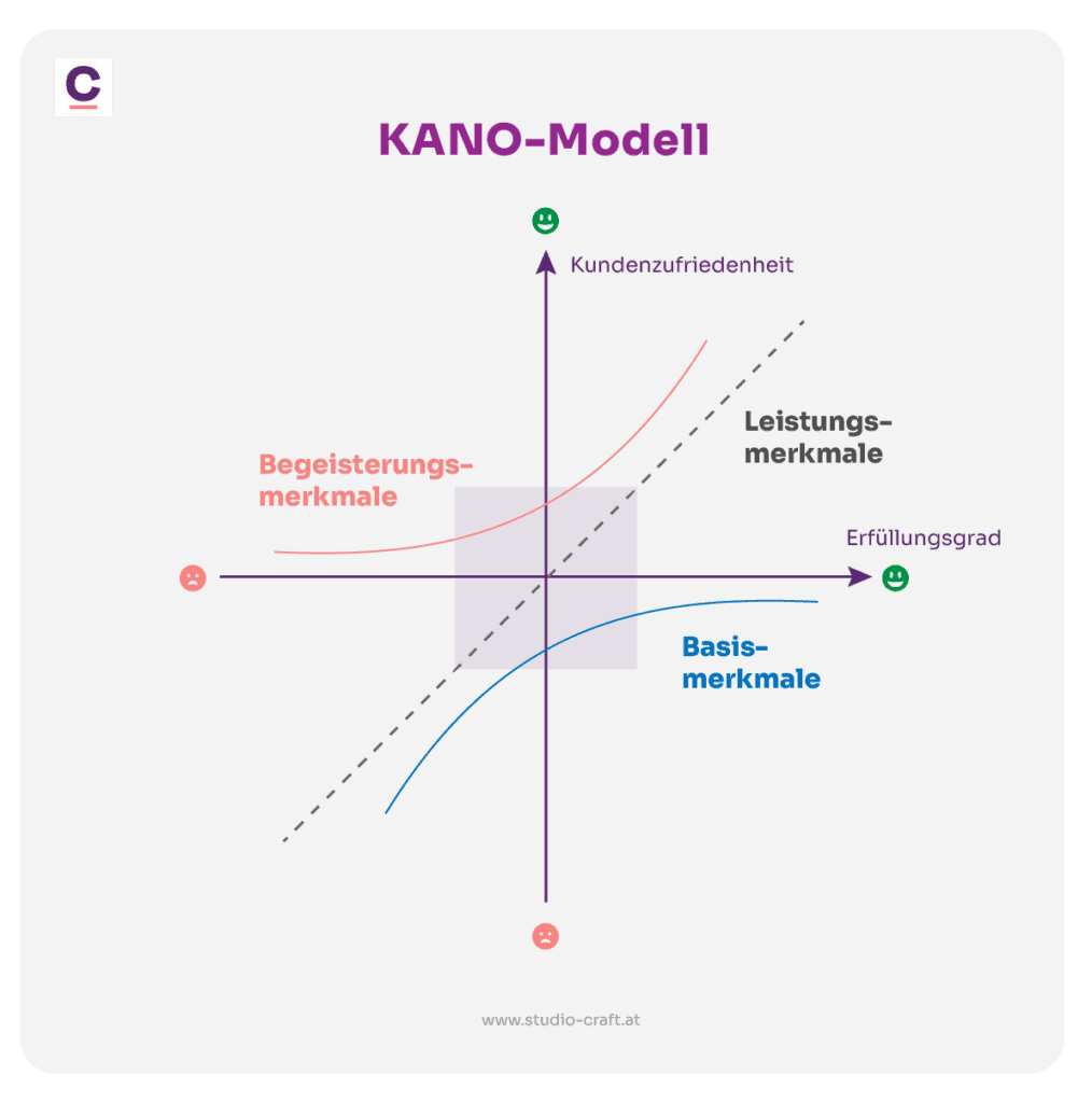 - Basismerkmale sind Selbstverständlichkeiten, die erwartet werden. Ihre Erfüllung sorgt kaum für Zufriedenheit, das Fehlen aber für Unzufriedenheit.